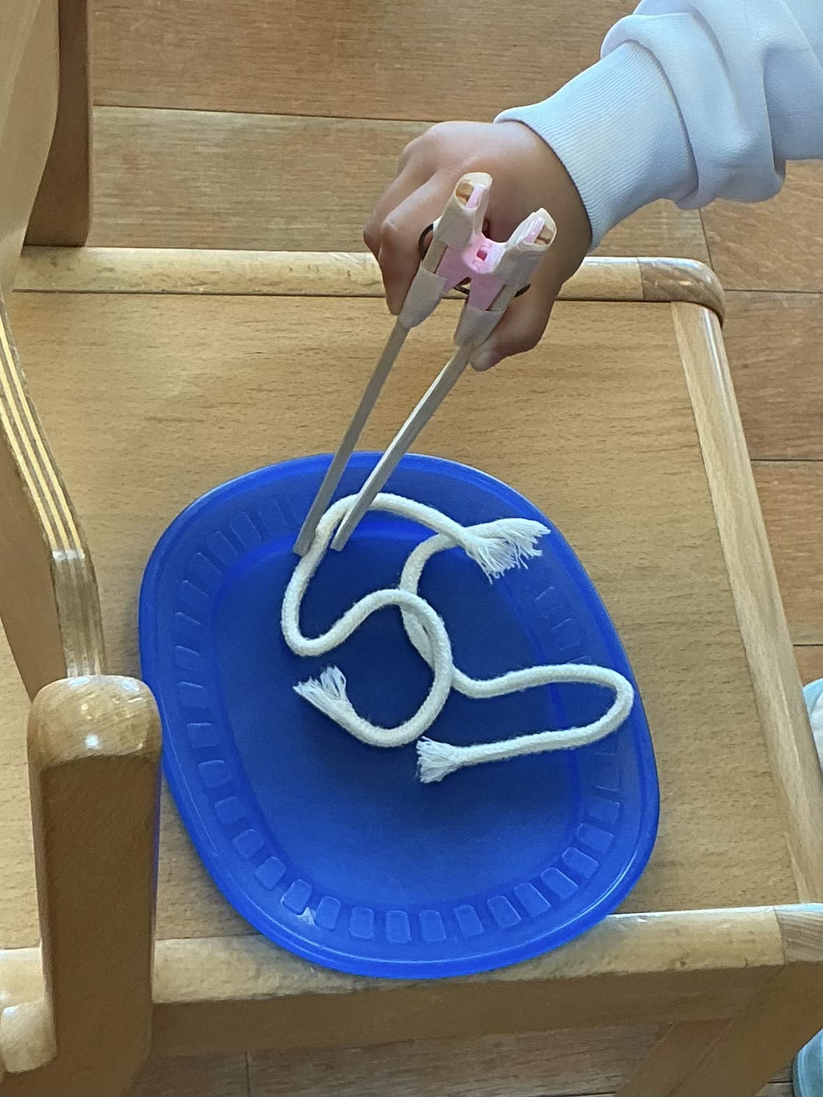 ポンポンやうどんに見立てた紐をお箸で挟んで