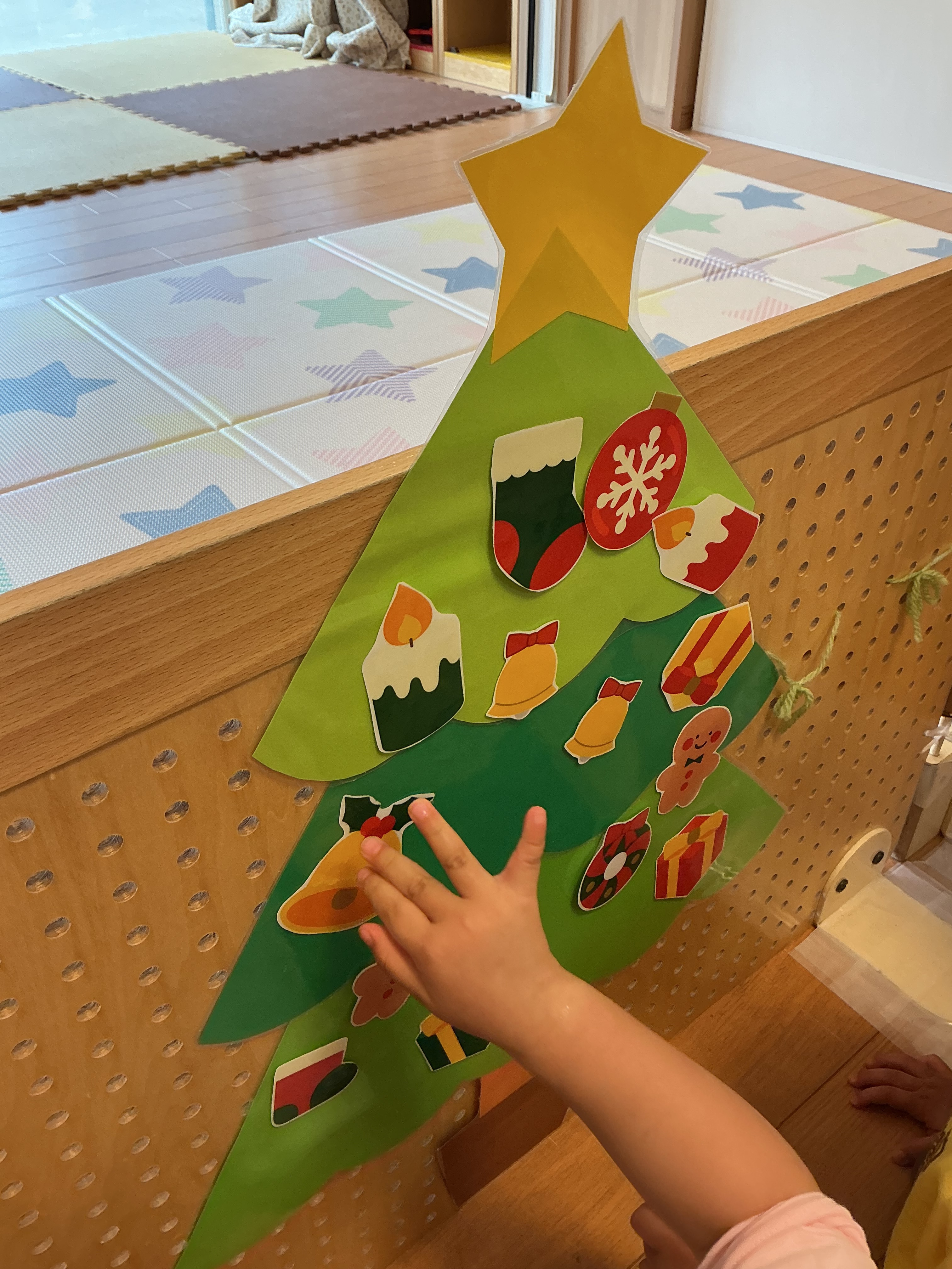 クリスマスツリーに飾りをつけました。