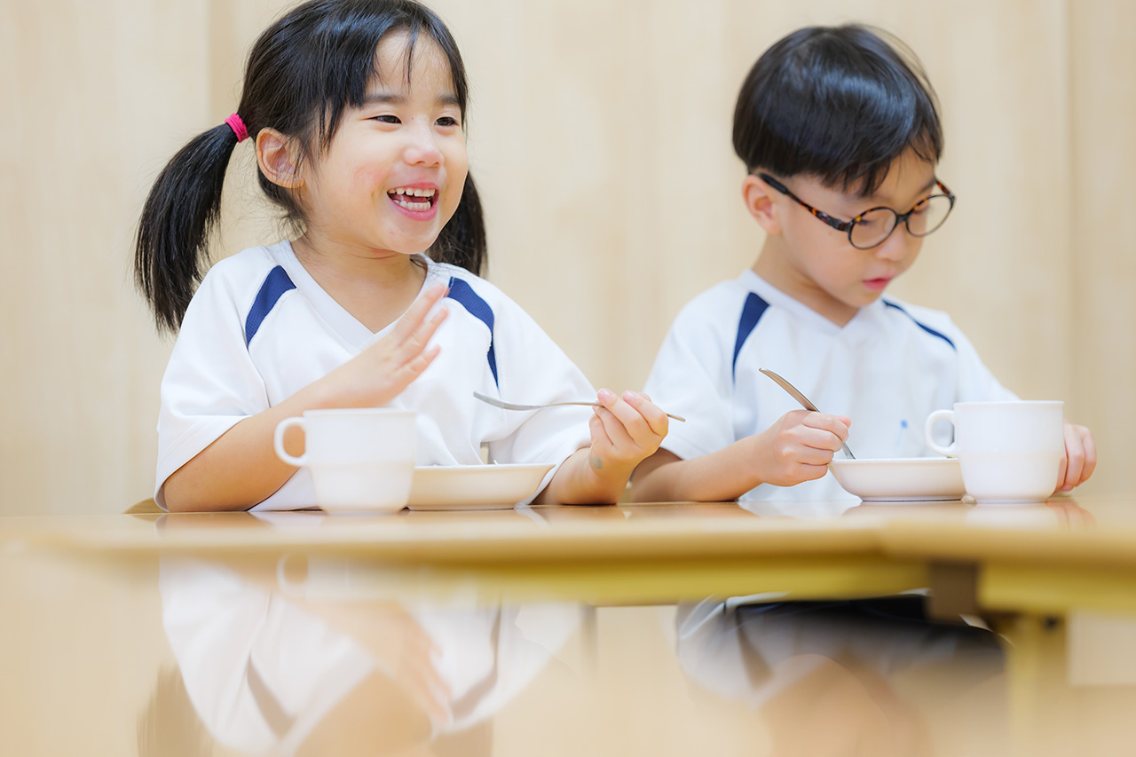 おいしくて楽しい給食の時間!少食や偏食のお子様の少しずつ食べられるようにしています。食事のマナーも身につきますよ!
