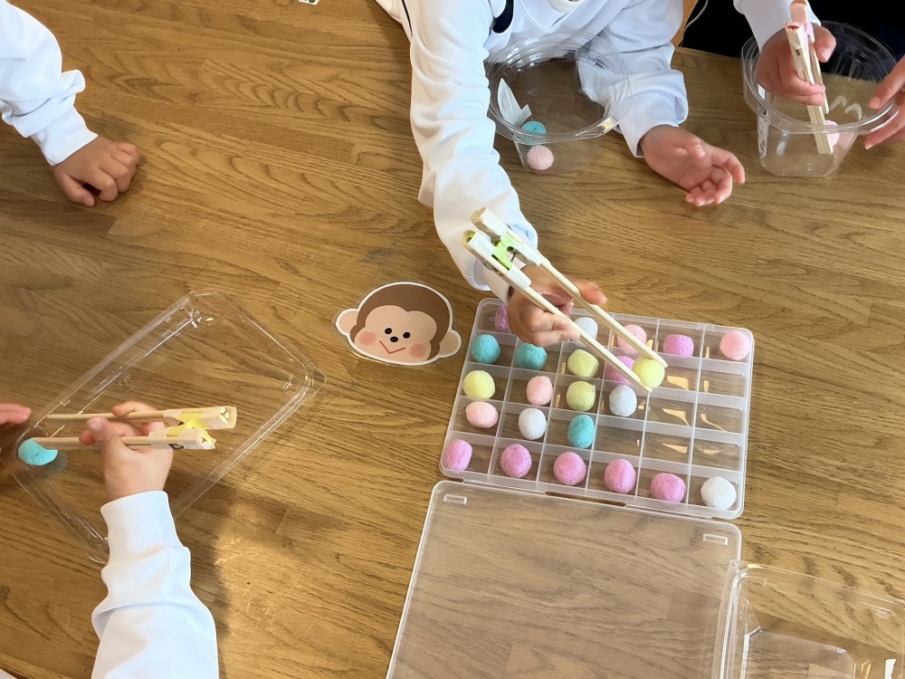 みんなお箸に興味を持って、指先を使って楽しんでいました。